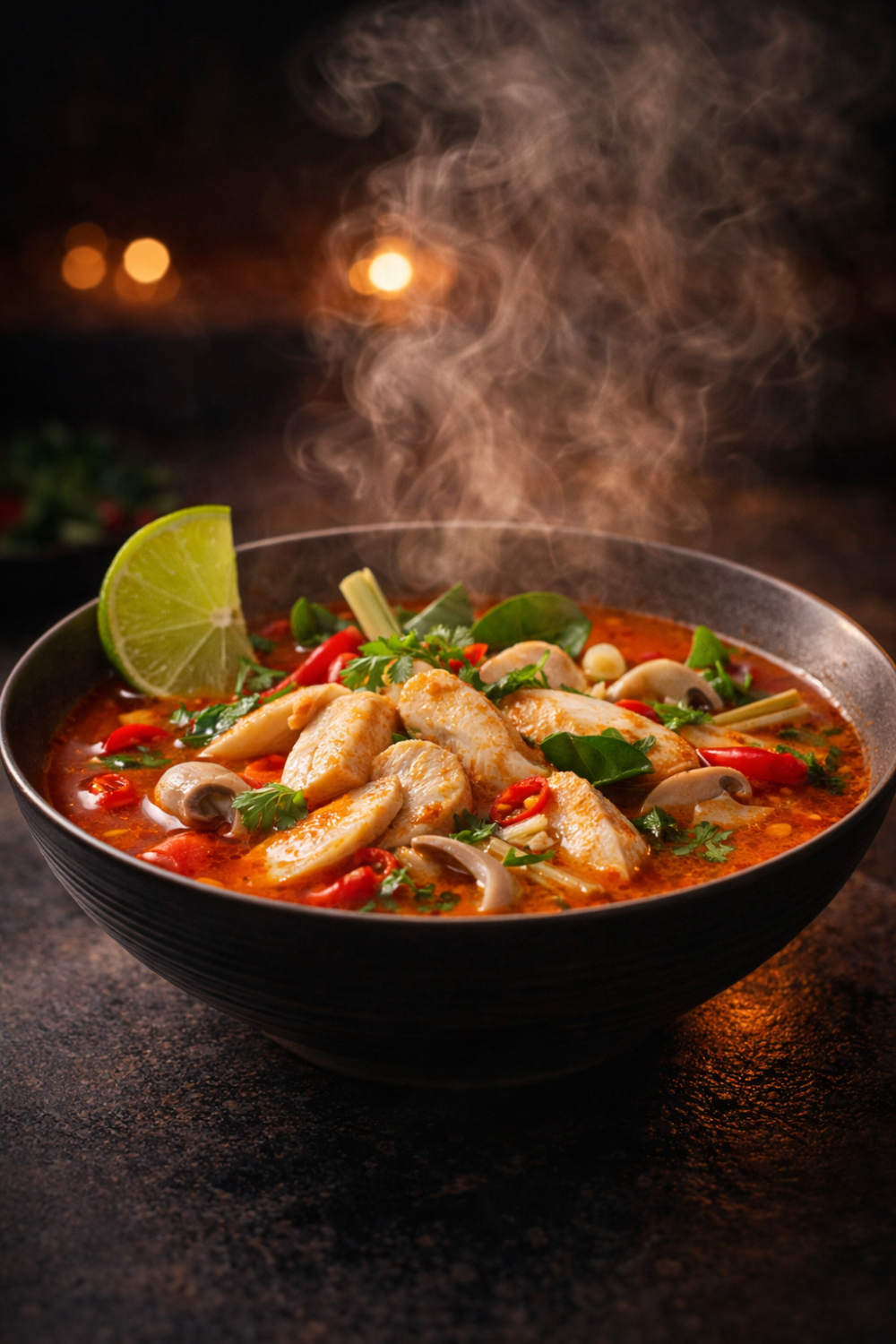Хотите разнообразить меню? Закажите суп «Том Ям с курицей»! Это традиционный тайский суп на мясном бульоне с том ям пастой, нежным куриным филе и шампиньонами. Пикантности ему добавляют имбирь, перец чили и лемонграсс. А лист кафира придаёт супу особый цитрусовый аромат.