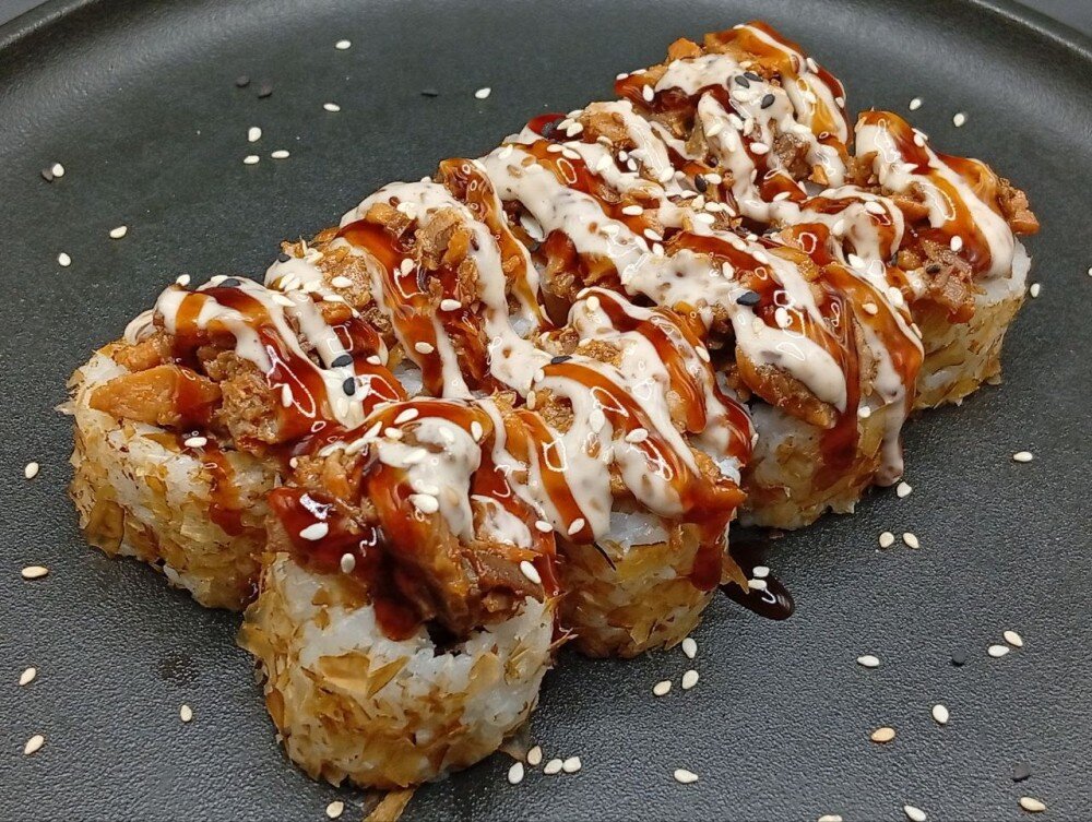 Бонито с лососем-терияки — нежный ролл с хрустящим огурцом и сливочным сыром внутри, а снаружи - сочный жареный лосось в соусе терияки и ароматная стружка копчёного тунца, которая добавляет яркий умами-вкус и лёгкий дымный акцент